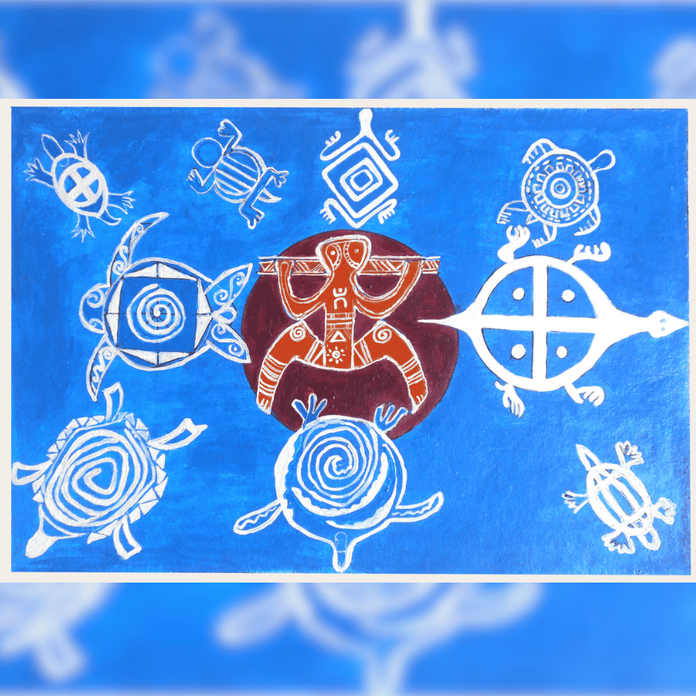 Rendered in bold colors and tribal-inspired motifs, the shell is filled with rhythmic geometry, echoing celestial maps and spiritual diagrams. Surrounding elements suggest a world in motion — a universe where nature and cosmos merge into one continuous cycle.