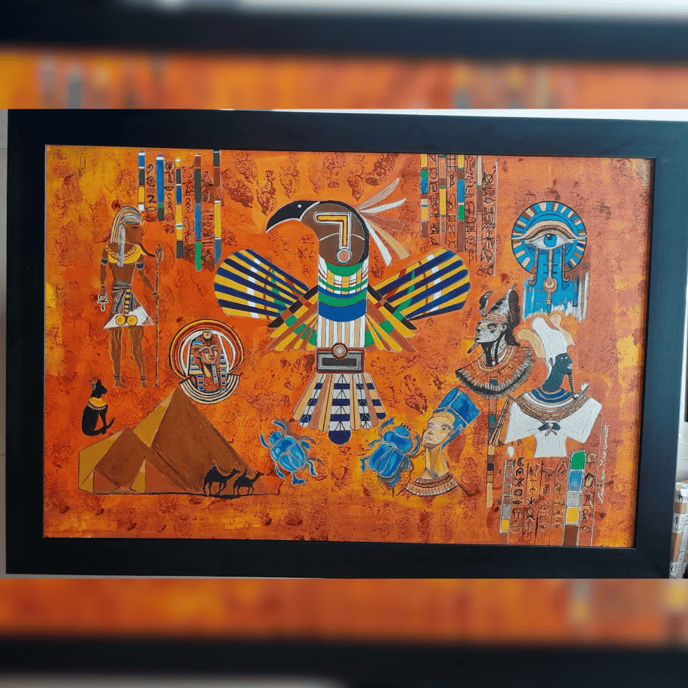 “Egypt at a Glance” by Gautam Mazumdar is a mesmerizing visual chronicle that unites the grandeur, mysticism, and symbolism of ancient Egypt into one cohesive artwork. At its heart stands a majestic eagle, the emblem of divine power and the spirit of Horus, spreading its wings across time.