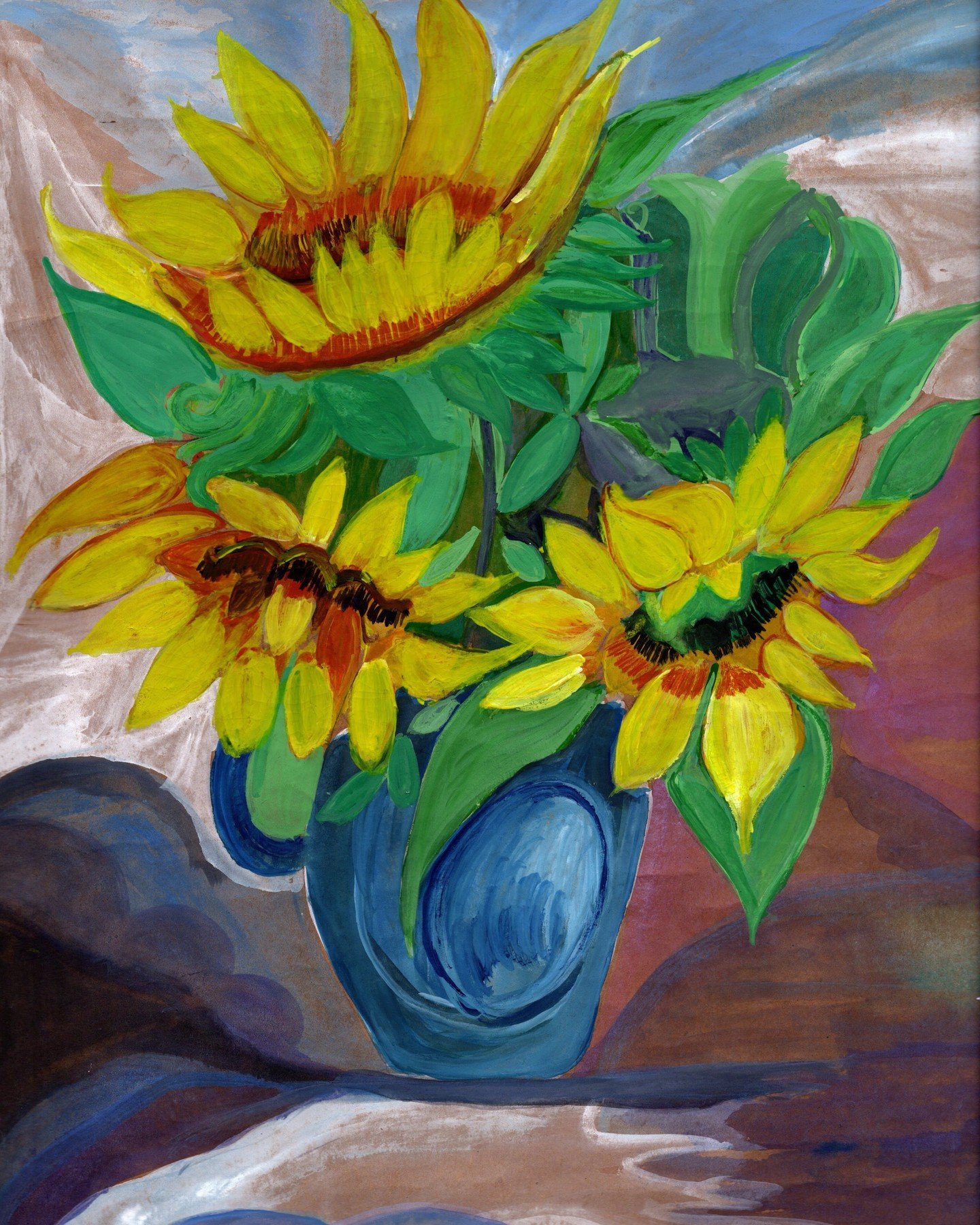 Sunflower & Blue Jar is an original artwork by Gautam Mazumdar, created with watercolours on brown paper. Measuring 32.5 × 45.72 cm (12.8 × 18 in), this still-life painting beautifully captures the bright vibrancy of sunflowers arranged in a blue jar.