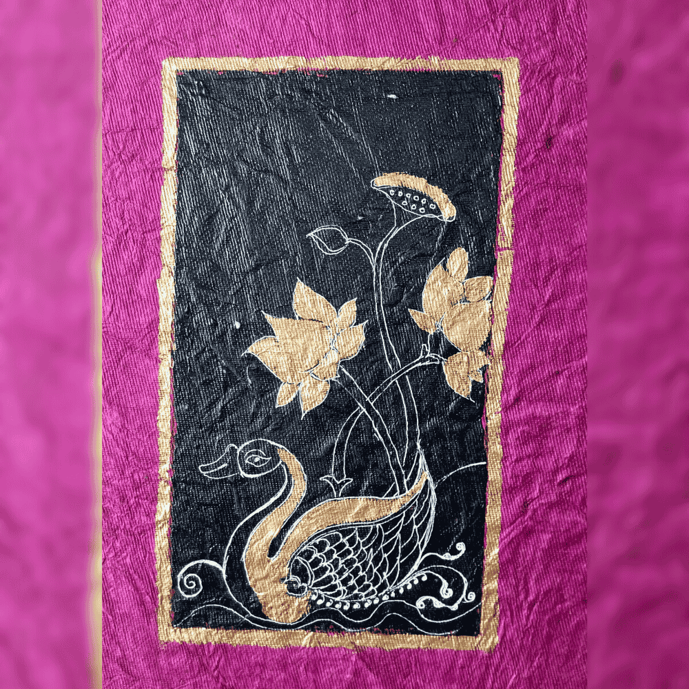 “The Golden Swan” is an original acrylic and pen artwork created in 2025 by Gautam Mazumdar. Executed on handmade purple paper, this hand-painted piece measures 16 inches (Height) × 10 inches (Breadth) and presents a refined interplay of symbolism, texture, and color.