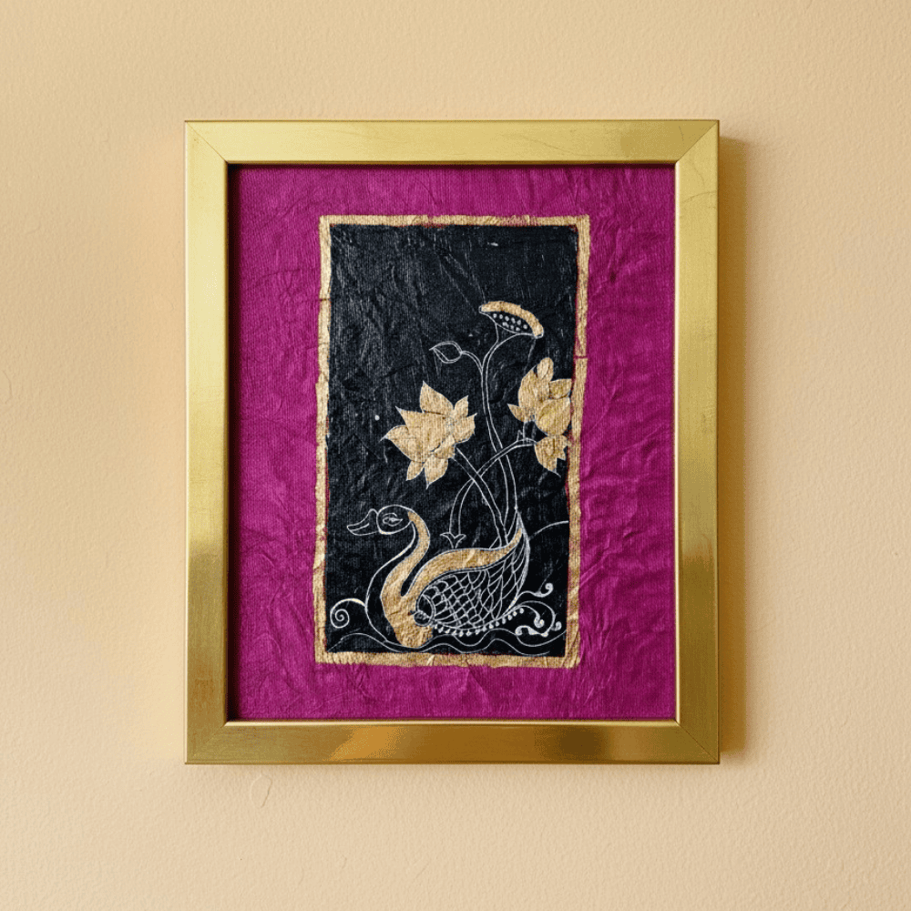 At the heart of the composition stands a golden swan surrounded by lotus flowers, placed within a textured black rectangular field. This central motif is delicately framed by a thin, shimmering gold border that mirrors the luminous tones of the swan and lotus, creating harmony and visual balance. Precise pen line work defines intricate details, while layered acrylic textures add depth and richness.